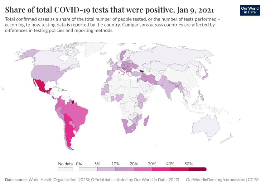 “Data Page: Share of total COVID-19 tests that were positive”. Our World in Data (2025). Data adapted from World Health Organization, Official data collated by Our World in Data. Retrieved from https://archive.ourworldindata.org/20251226-063332/grapher/covid-19-positive-rate-bar.html [online resource] (archived on December 26, 2025).How to cite this data