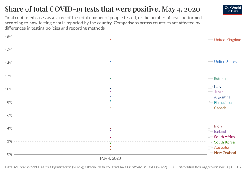“Data Page: Share of total COVID-19 tests that were positive”. Our World in Data (2025). Data adapted from World Health Organization, Official data collated by Our World in Data. Retrieved from https://archive.ourworldindata.org/20251223-063440/grapher/covid-19-positive-rate-bar.html [online resource] (archived on December 23, 2025).