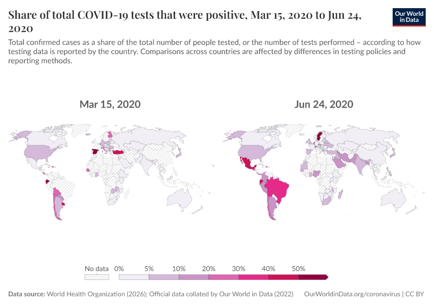 “Data Page: Share of total COVID-19 tests that were positive”. Our World in Data (2026). Data adapted from World Health Organization, Official data collated by Our World in Data. Retrieved from https://archive.ourworldindata.org/20260402-063304/grapher/covid-19-positive-rate-bar.html [online resource] (archived on April 2, 2026).How to cite this data