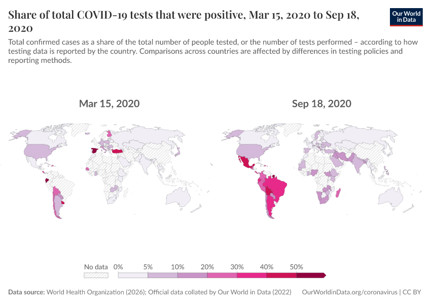 “Data Page: Share of total COVID-19 tests that were positive”. Our World in Data (2026). Data adapted from World Health Organization, Official data collated by Our World in Data. Retrieved from https://archive.ourworldindata.org/20260404-063300/grapher/covid-19-positive-rate-bar.html [online resource] (archived on April 4, 2026).How to cite this data