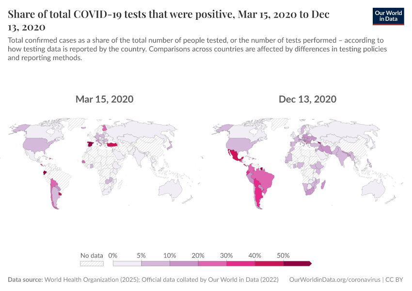 “Data Page: Share of total COVID-19 tests that were positive”. Our World in Data (2025). Data adapted from World Health Organization, Official data collated by Our World in Data. Retrieved from https://archive.ourworldindata.org/20251219-063428/grapher/covid-19-positive-rate-bar.html [online resource] (archived on December 19, 2025).How to cite this data