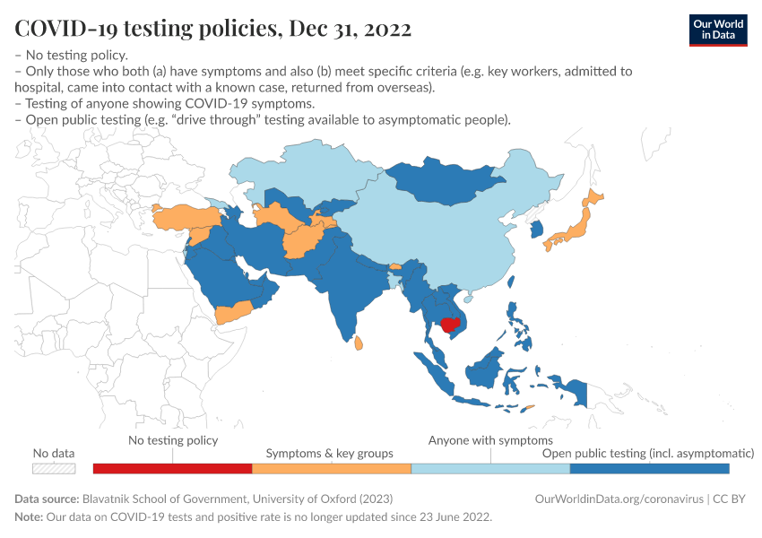 Blavatnik School of Government, University of Oxford (2023) – with minor processing by Our World in Data. “COVID-19 testing policies” [dataset]. Blavatnik School of Government, University of Oxford, “Government Response Tracker (OxCGRT)” [original data]. Retrieved December 20, 2025 from https://archive.ourworldindata.org/20250909-093708/grapher/covid-19-testing-policy.html (archived on September 9, 2025).