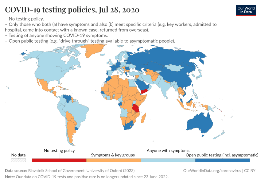 Blavatnik School of Government, University of Oxford (2023) – with minor processing by Our World in Data. “COVID-19 testing policies” [dataset]. Blavatnik School of Government, University of Oxford, “Government Response Tracker (OxCGRT)” [original data]. Retrieved December 8, 2025 from https://archive.ourworldindata.org/20250909-093708/grapher/covid-19-testing-policy.html (archived on September 9, 2025).
