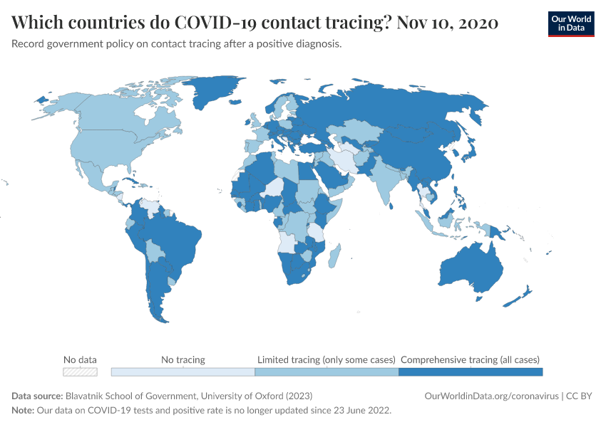 Blavatnik School of Government, University of Oxford (2023) – with minor processing by Our World in Data. “Which countries do COVID-19 contact tracing?” [dataset]. Blavatnik School of Government, University of Oxford, “Government Response Tracker (OxCGRT)” [original data]. Retrieved February 22, 2026 from https://archive.ourworldindata.org/20250909-093708/grapher/covid-contact-tracing.html (archived on September 9, 2025).