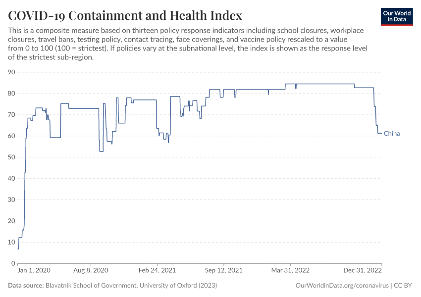 “Data Page: COVID-19 Containment and Health Index”, part of the following publication: Edouard Mathieu, Hannah Ritchie, Lucas Rodés-Guirao, Cameron Appel, Daniel Gavrilov, Charlie Giattino, Joe Hasell, Bobbie Macdonald, Saloni Dattani, Diana Beltekian, Esteban Ortiz-Ospina, and Max Roser (2020) - “COVID-19 Pandemic”. Data adapted from Blavatnik School of Government, University of Oxford. Retrieved from https://archive.ourworldindata.org/20250909-093708/grapher/covid-containment-and-health-index.html [online resource] (archived on September 9, 2025).How to cite this data