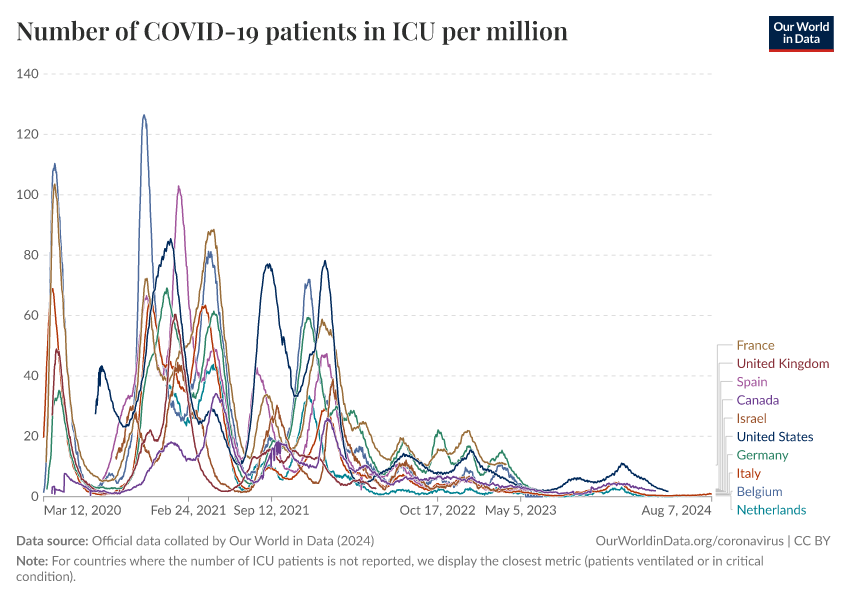 Official data collated by Our World in Data (2024) – processed by Our World in Data. “Number of COVID-19 patients in ICU per million” [dataset]. Official data collated by Our World in Data, “COVID-19, hospitalisations” [original data]. Retrieved April 5, 2026 from https://archive.ourworldindata.org/20260304-094028/grapher/covid-icu-patients-per-million.html (archived on March 4, 2026).Download