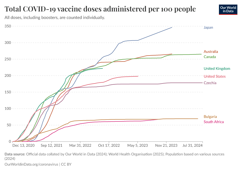 Official data collated by Our World in Data (2024); World Health Organisation (2025); Population based on various sources (2024) – with major processing by Our World in Data. “Total COVID-19 vaccine doses administered per 100 people” [dataset]. Official data collated by Our World in Data, “COVID-19, vaccinations”; World Health Organisation, “COVID-19, vaccinations (WHO)”; Various sources, “Population” [original data]. Retrieved April 3, 2026 from https://archive.ourworldindata.org/20260402-164039/grapher/covid-vaccination-doses-per-capita.html (archived on April 2, 2026).