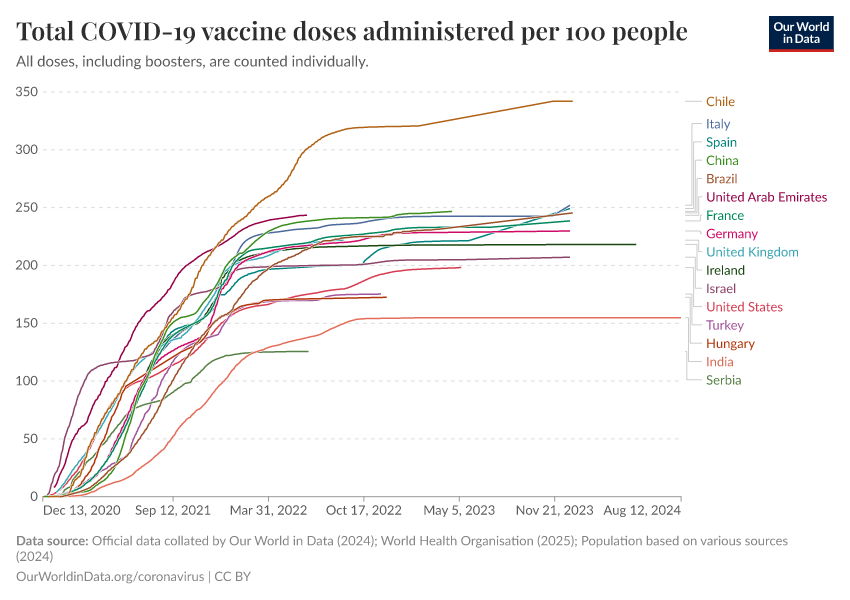 “Data Page: Total COVID-19 vaccine doses administered per 100 people”, part of the following publication: Edouard Mathieu, Hannah Ritchie, Lucas Rodés-Guirao, Cameron Appel, Daniel Gavrilov, Charlie Giattino, Joe Hasell, Bobbie Macdonald, Saloni Dattani, Diana Beltekian, Esteban Ortiz-Ospina, and Max Roser (2020) - “COVID-19 Pandemic”. Data adapted from Official data collated by Our World in Data, World Health Organisation, Various sources. Retrieved from https://archive.ourworldindata.org/20250925-233948/grapher/covid-vaccination-doses-per-capita.html [online resource] (archived on September 25, 2025).