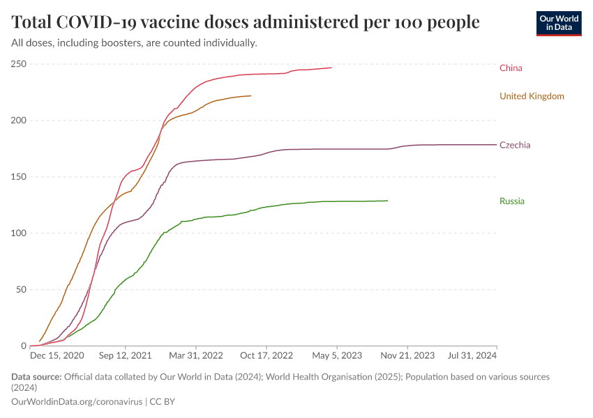 Official data collated by Our World in Data (2024); World Health Organisation (2025); Population based on various sources (2024) – with major processing by Our World in Data. “Total COVID-19 vaccine doses administered per 100 people” [dataset]. Official data collated by Our World in Data, “COVID-19, vaccinations”; World Health Organisation, “COVID-19, vaccinations (WHO)”; Various sources, “Population” [original data]. Retrieved January 22, 2026 from https://archive.ourworldindata.org/20260119-065148/grapher/covid-vaccination-doses-per-capita.html (archived on January 19, 2026).