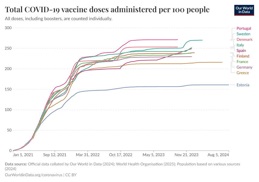“Data Page: Total COVID-19 vaccine doses administered per 100 people”, part of the following publication: Edouard Mathieu, Hannah Ritchie, Lucas Rodés-Guirao, Cameron Appel, Daniel Gavrilov, Charlie Giattino, Joe Hasell, Bobbie Macdonald, Saloni Dattani, Diana Beltekian, Esteban Ortiz-Ospina, and Max Roser (2020) - “COVID-19 Pandemic”. Data adapted from Official data collated by Our World in Data, World Health Organisation, Various sources. Retrieved from https://archive.ourworldindata.org/20250925-233948/grapher/covid-vaccination-doses-per-capita.html [online resource] (archived on September 25, 2025).