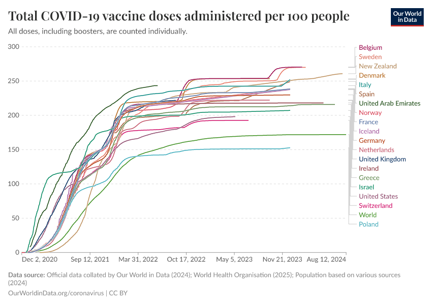 “Data Page: Total COVID-19 vaccine doses administered per 100 people”, part of the following publication: Edouard Mathieu, Hannah Ritchie, Lucas Rodés-Guirao, Cameron Appel, Daniel Gavrilov, Charlie Giattino, Joe Hasell, Bobbie Macdonald, Saloni Dattani, Diana Beltekian, Esteban Ortiz-Ospina, and Max Roser (2020) - “COVID-19 Pandemic”. Data adapted from Official data collated by Our World in Data, World Health Organisation, Various sources. Retrieved from https://archive.ourworldindata.org/20250925-233948/grapher/covid-vaccination-doses-per-capita.html [online resource] (archived on September 25, 2025).How to cite this data