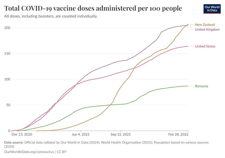 Official data collated by Our World in Data (2024); World Health Organisation (2025); Population based on various sources (2024) – with major processing by Our World in Data. “Total COVID-19 vaccine doses administered per 100 people” [dataset]. Official data collated by Our World in Data, “COVID-19, vaccinations”; World Health Organisation, “COVID-19, vaccinations (WHO)”; Various sources, “Population” [original data]. Retrieved April 18, 2026 from https://archive.ourworldindata.org/20260417-112857/grapher/covid-vaccination-doses-per-capita.html (archived on April 17, 2026).Download