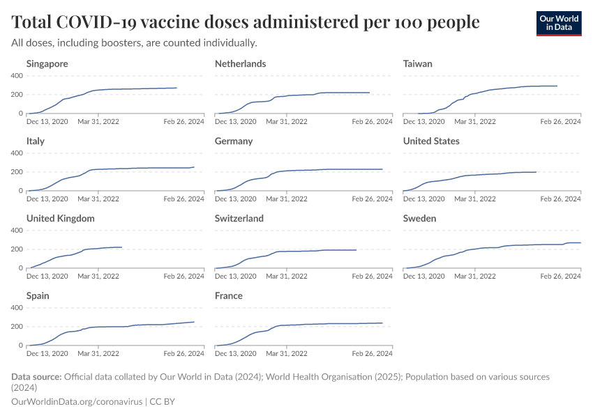 Official data collated by Our World in Data (2024); World Health Organisation (2025); Population based on various sources (2024) – with major processing by Our World in Data. “Total COVID-19 vaccine doses administered per 100 people” [dataset]. Official data collated by Our World in Data, “COVID-19, vaccinations”; World Health Organisation, “COVID-19, vaccinations (WHO)”; Various sources, “Population” [original data]. Retrieved December 8, 2025 from https://archive.ourworldindata.org/20250925-233948/grapher/covid-vaccination-doses-per-capita.html (archived on September 25, 2025).