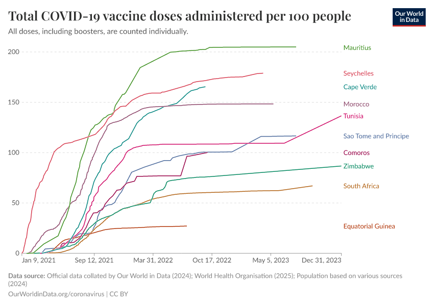 “Data Page: Total COVID-19 vaccine doses administered per 100 people”, part of the following publication: Edouard Mathieu, Hannah Ritchie, Lucas Rodés-Guirao, Cameron Appel, Daniel Gavrilov, Charlie Giattino, Joe Hasell, Bobbie Macdonald, Saloni Dattani, Diana Beltekian, Esteban Ortiz-Ospina, and Max Roser (2020) - “COVID-19 Pandemic”. Data adapted from Official data collated by Our World in Data, World Health Organisation, Various sources. Retrieved from https://archive.ourworldindata.org/20250925-233948/grapher/covid-vaccination-doses-per-capita.html [online resource] (archived on September 25, 2025).How to cite this data