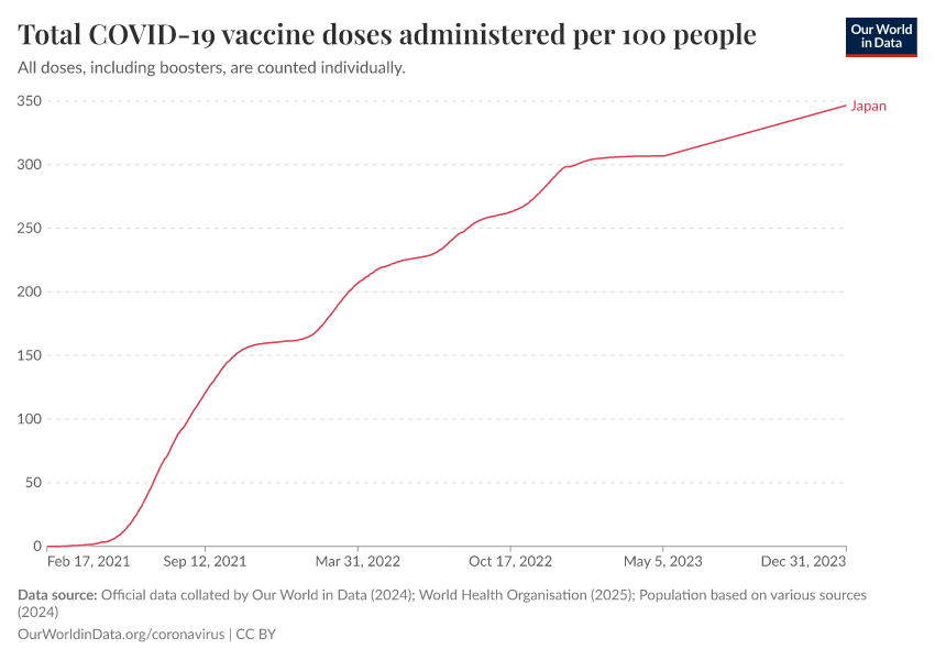 Official data collated by Our World in Data (2024); World Health Organisation (2025); Population based on various sources (2024) – with major processing by Our World in Data. “Total COVID-19 vaccine doses administered per 100 people” [dataset]. Official data collated by Our World in Data, “COVID-19, vaccinations”; World Health Organisation, “COVID-19, vaccinations (WHO)”; Various sources, “Population” [original data]. Retrieved January 10, 2026 from https://archive.ourworldindata.org/20250925-233948/grapher/covid-vaccination-doses-per-capita.html (archived on September 25, 2025).