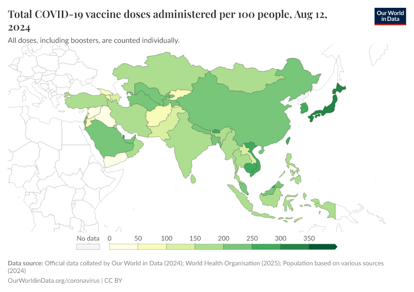 Official data collated by Our World in Data (2024); World Health Organisation (2025); Population based on various sources (2024) – with major processing by Our World in Data. “Total COVID-19 vaccine doses administered per 100 people” [dataset]. Official data collated by Our World in Data, “COVID-19, vaccinations”; World Health Organisation, “COVID-19, vaccinations (WHO)”; Various sources, “Population” [original data]. Retrieved December 26, 2025 from https://archive.ourworldindata.org/20250925-233948/grapher/covid-vaccination-doses-per-capita.html (archived on September 25, 2025).