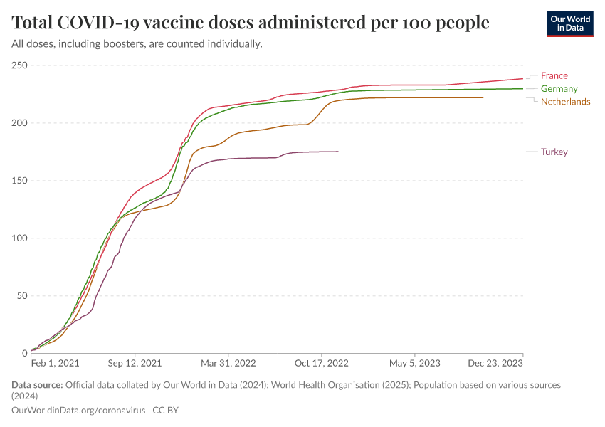 Official data collated by Our World in Data (2024); World Health Organisation (2025); Population based on various sources (2024) – with major processing by Our World in Data. “Total COVID-19 vaccine doses administered per 100 people” [dataset]. Official data collated by Our World in Data, “COVID-19, vaccinations”; World Health Organisation, “COVID-19, vaccinations (WHO)”; Various sources, “Population” [original data]. Retrieved December 17, 2025 from https://archive.ourworldindata.org/20250925-233948/grapher/covid-vaccination-doses-per-capita.html (archived on September 25, 2025).
