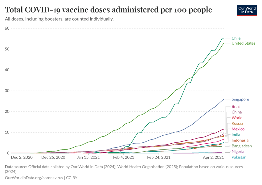 “Data Page: Total COVID-19 vaccine doses administered per 100 people”, part of the following publication: Edouard Mathieu, Hannah Ritchie, Lucas Rodés-Guirao, Cameron Appel, Daniel Gavrilov, Charlie Giattino, Joe Hasell, Bobbie Macdonald, Saloni Dattani, Diana Beltekian, Esteban Ortiz-Ospina, and Max Roser (2020) - “COVID-19 Pandemic”. Data adapted from Official data collated by Our World in Data, World Health Organisation, Various sources. Retrieved from https://archive.ourworldindata.org/20250925-233948/grapher/covid-vaccination-doses-per-capita.html [online resource] (archived on September 25, 2025).