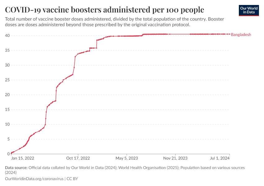 Official data collated by Our World in Data (2024); World Health Organisation (2025); Population based on various sources (2024) – with major processing by Our World in Data. “COVID-19 vaccine boosters administered per 100 people” [dataset]. Official data collated by Our World in Data, “COVID-19, vaccinations”; World Health Organisation, “COVID-19, vaccinations (WHO)”; Various sources, “Population” [original data]. Retrieved April 20, 2026 from https://archive.ourworldindata.org/20260417-112857/grapher/covid-vaccine-booster-doses-per-capita.html (archived on April 17, 2026).