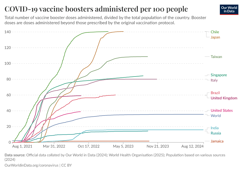 Official data collated by Our World in Data (2024); World Health Organisation (2025); Population based on various sources (2024) – with major processing by Our World in Data. “COVID-19 vaccine boosters administered per 100 people” [dataset]. Official data collated by Our World in Data, “COVID-19, vaccinations”; World Health Organisation, “COVID-19, vaccinations (WHO)”; Various sources, “Population” [original data]. Retrieved January 8, 2026 from https://archive.ourworldindata.org/20250925-233948/grapher/covid-vaccine-booster-doses-per-capita.html (archived on September 25, 2025).
