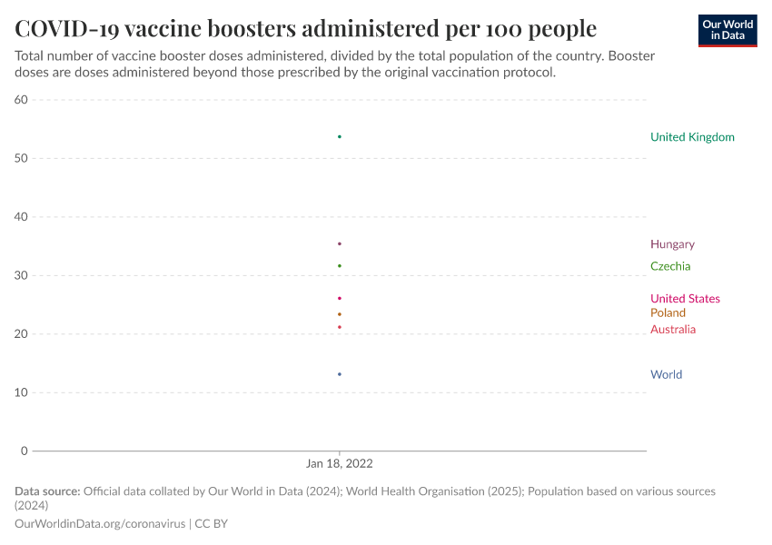 “Data Page: COVID-19 vaccine boosters administered per 100 people”, part of the following publication: Edouard Mathieu, Hannah Ritchie, Lucas Rodés-Guirao, Cameron Appel, Daniel Gavrilov, Charlie Giattino, Joe Hasell, Bobbie Macdonald, Saloni Dattani, Diana Beltekian, Esteban Ortiz-Ospina, and Max Roser (2020) - “COVID-19 Pandemic”. Data adapted from Official data collated by Our World in Data, World Health Organisation, Various sources. Retrieved from https://archive.ourworldindata.org/20250925-233948/grapher/covid-vaccine-booster-doses-per-capita.html [online resource] (archived on September 25, 2025).How to cite this data