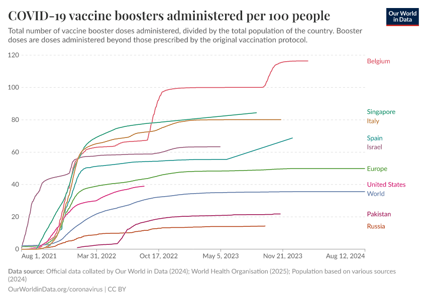 Official data collated by Our World in Data (2024); World Health Organisation (2025); Population based on various sources (2024) – with major processing by Our World in Data. “COVID-19 vaccine boosters administered per 100 people” [dataset]. Official data collated by Our World in Data, “COVID-19, vaccinations”; World Health Organisation, “COVID-19, vaccinations (WHO)”; Various sources, “Population” [original data]. Retrieved December 8, 2025 from https://archive.ourworldindata.org/20250925-233948/grapher/covid-vaccine-booster-doses-per-capita.html (archived on September 25, 2025).