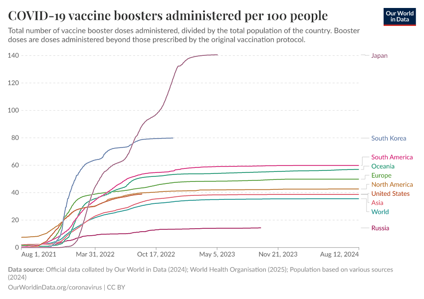 Official data collated by Our World in Data (2024); World Health Organisation (2025); Population based on various sources (2024) – with major processing by Our World in Data. “COVID-19 vaccine boosters administered per 100 people” [dataset]. Official data collated by Our World in Data, “COVID-19, vaccinations”; World Health Organisation, “COVID-19, vaccinations (WHO)”; Various sources, “Population” [original data]. Retrieved December 7, 2025 from https://archive.ourworldindata.org/20250925-233948/grapher/covid-vaccine-booster-doses-per-capita.html (archived on September 25, 2025).