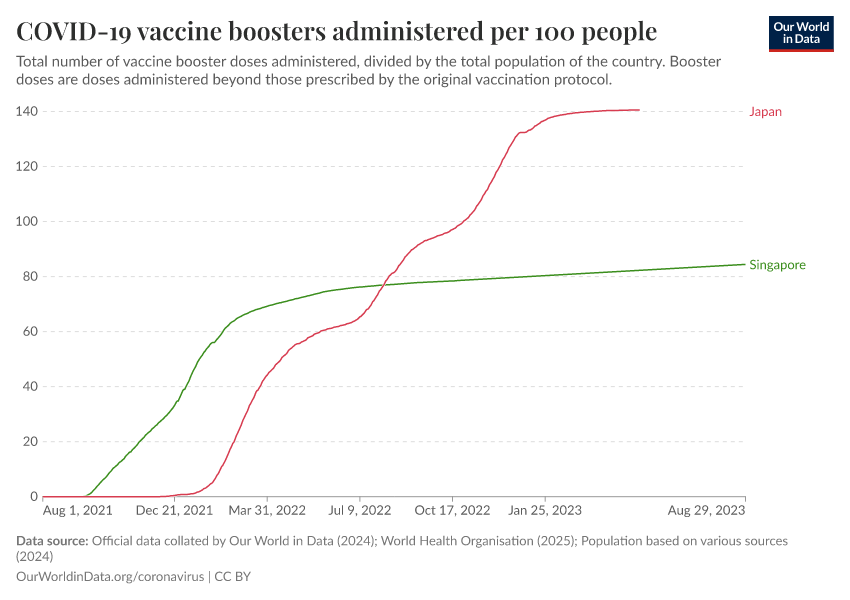 Official data collated by Our World in Data (2024); World Health Organisation (2025); Population based on various sources (2024) – with major processing by Our World in Data. “COVID-19 vaccine boosters administered per 100 people” [dataset]. Official data collated by Our World in Data, “COVID-19, vaccinations”; World Health Organisation, “COVID-19, vaccinations (WHO)”; Various sources, “Population” [original data]. Retrieved January 17, 2026 from https://archive.ourworldindata.org/20250925-233948/grapher/covid-vaccine-booster-doses-per-capita.html (archived on September 25, 2025).