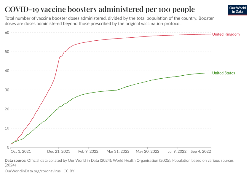 Official data collated by Our World in Data (2024); World Health Organisation (2025); Population based on various sources (2024) – with major processing by Our World in Data. “COVID-19 vaccine boosters administered per 100 people” [dataset]. Official data collated by Our World in Data, “COVID-19, vaccinations”; World Health Organisation, “COVID-19, vaccinations (WHO)”; Various sources, “Population” [original data]. Retrieved February 23, 2026 from https://archive.ourworldindata.org/20260119-065148/grapher/covid-vaccine-booster-doses-per-capita.html (archived on January 19, 2026).