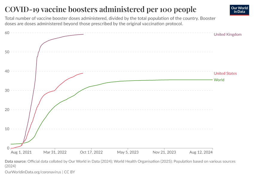 Official data collated by Our World in Data (2024); World Health Organisation (2025); Population based on various sources (2024) – with major processing by Our World in Data. “COVID-19 vaccine boosters administered per 100 people” [dataset]. Official data collated by Our World in Data, “COVID-19, vaccinations”; World Health Organisation, “COVID-19, vaccinations (WHO)”; Various sources, “Population” [original data]. Retrieved February 7, 2026 from https://archive.ourworldindata.org/20260119-065148/grapher/covid-vaccine-booster-doses-per-capita.html (archived on January 19, 2026).