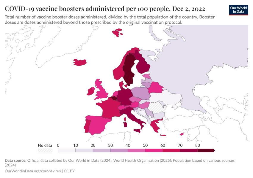 “Data Page: COVID-19 vaccine boosters administered per 100 people”, part of the following publication: Edouard Mathieu, Hannah Ritchie, Lucas Rodés-Guirao, Cameron Appel, Daniel Gavrilov, Charlie Giattino, Joe Hasell, Bobbie Macdonald, Saloni Dattani, Diana Beltekian, Esteban Ortiz-Ospina, and Max Roser (2020) - “COVID-19 Pandemic”. Data adapted from Official data collated by Our World in Data, World Health Organisation, Various sources. Retrieved from https://archive.ourworldindata.org/20250925-233948/grapher/covid-vaccine-booster-doses-per-capita.html [online resource] (archived on September 25, 2025).