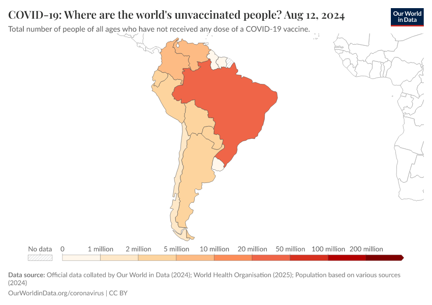 Official data collated by Our World in Data (2024); World Health Organisation (2025); Population based on various sources (2024) – with major processing by Our World in Data. “COVID-19: Where are the world's unvaccinated people?” [dataset]. Official data collated by Our World in Data, “COVID-19, vaccinations”; World Health Organisation, “COVID-19, vaccinations (WHO)”; Various sources, “Population” [original data]. Retrieved January 16, 2026 from https://archive.ourworldindata.org/20250925-233948/grapher/covid-world-unvaccinated-people.html (archived on September 25, 2025).
