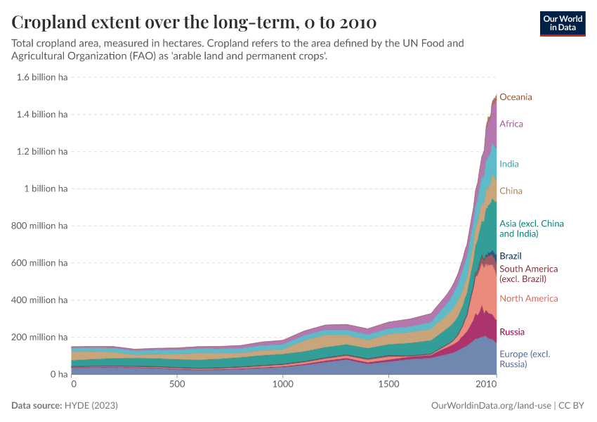 HYDE (2023) – with minor processing by Our World in Data. “Cropland extent over the long-term” [dataset]. PBL Netherlands Environmental Assessment Agency, “History Database of the Global Environment 3.3” [original data]. Retrieved January 14, 2026 from https://archive.ourworldindata.org/20251023-195030/grapher/cropland-use-over-the-long-term.html (archived on October 23, 2025).
