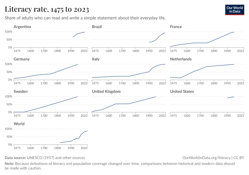 - However, measuring literacy over time is difficult, as definitions of what it means to be “literate” have varied widely across countries and historical periods. As a result, comparisons should be made with caution.