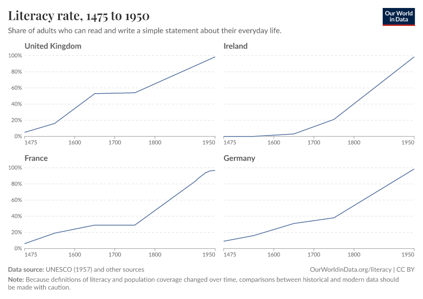 - 1451–1800: Direct literacy surveys did not exist during this period. Data for Great Britain, Ireland, France, Belgium, the Netherlands, Germany, Italy, Spain, Sweden, and Poland comes from the "Charting the Rise of the West" study. The authors estimated literacy rates using manuscript and book production as indirect indicators. While more books likely indicated more readers, this approach has clear limitations.