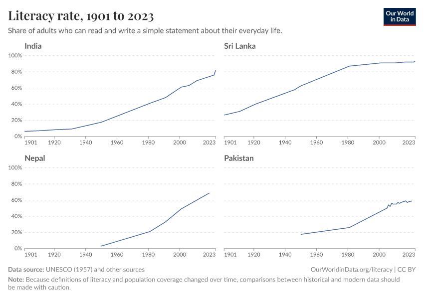 “Data Page: Literacy rate”, part of the following publication: Hannah Ritchie, Veronika Samborska, Natasha Ahuja, Esteban Ortiz-Ospina, and Max Roser (2023) - “Global Education”. Data adapted from UNESCO, Buringh and van Zanden, van Zanden, J. et al., UNESCO Institute for Statistics. Retrieved from https://archive.ourworldindata.org/20251210-172555/grapher/cross-country-literacy-rates.html [online resource] (archived on December 10, 2025).How to cite this data