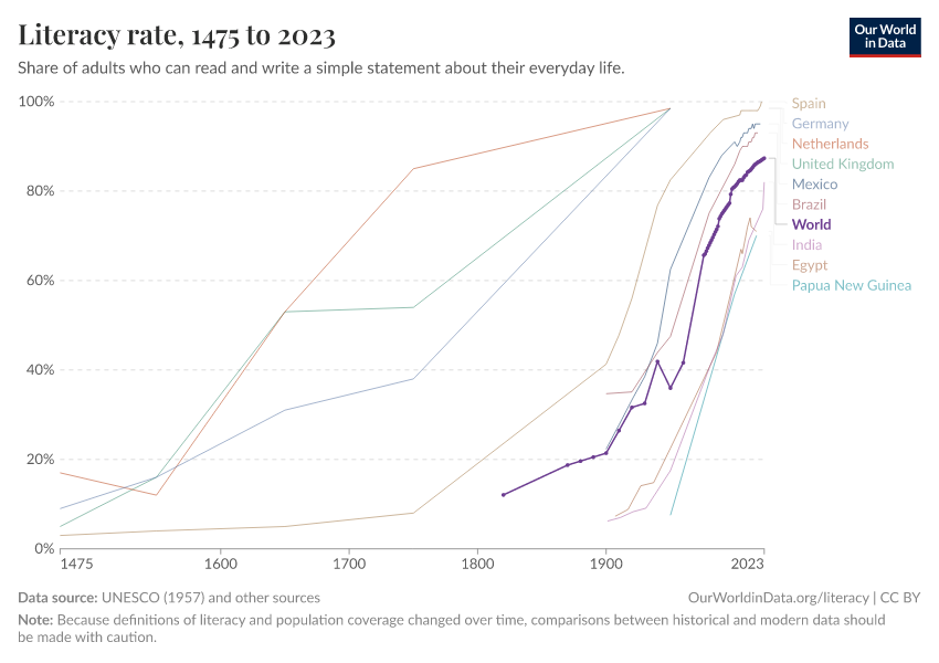 • However, measuring literacy over time is difficult, as definitions of what it means to be “literate” have varied widely across countries and historical periods. As a result, comparisons should be made with caution.