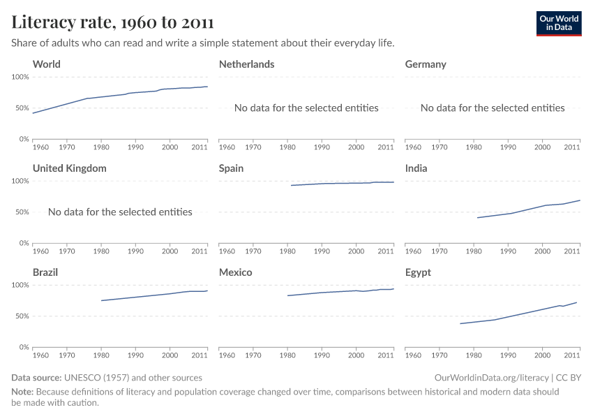 • However, measuring literacy over time is difficult, as definitions of what it means to be “literate” have varied widely across countries and historical periods. As a result, comparisons should be made with caution.