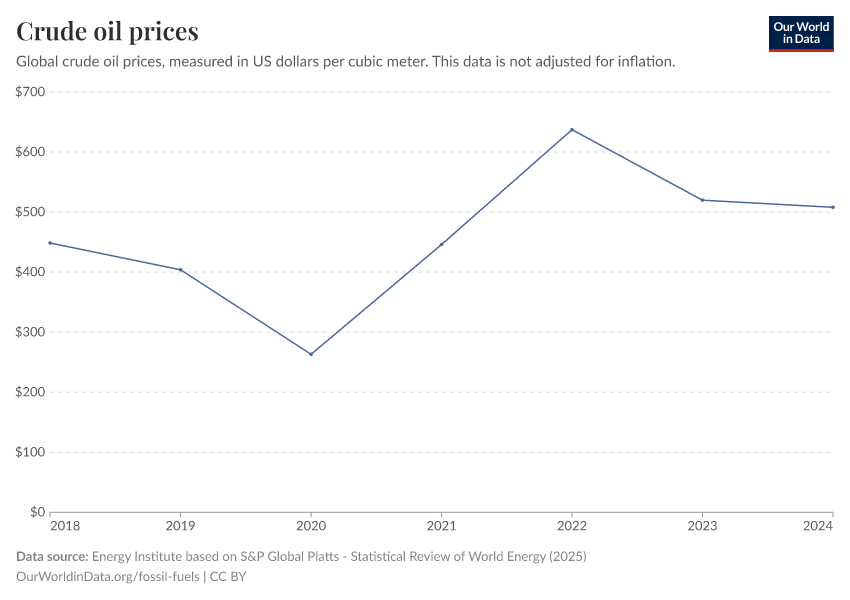 “Data Page: Oil price - Crude prices since 1861”, part of the following publication: Hannah Ritchie, Pablo Rosado, and Max Roser (2023) - “Energy”. Data adapted from Energy Institute. Retrieved from https://archive.ourworldindata.org/20250909-093708/grapher/crude-oil-prices.html [online resource] (archived on September 9, 2025).How to cite this data