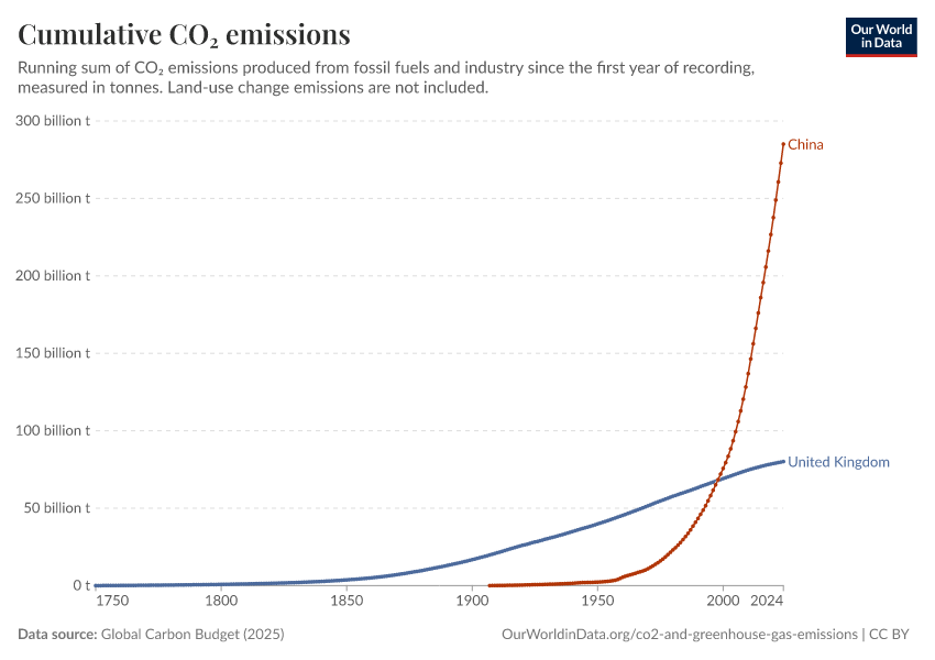 “Data Page: Cumulative CO₂ emissions”, part of the following publication: Hannah Ritchie, Pablo Rosado, and Max Roser (2023) - “CO₂ and Greenhouse Gas Emissions”. Data adapted from Global Carbon Project. Retrieved from https://archive.ourworldindata.org/20251204-133459/grapher/cumulative-co-emissions.html [online resource] (archived on December 4, 2025).How to cite this data