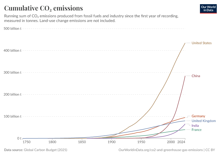 Global Carbon Budget (2025) – with major processing by Our World in Data. “Cumulative CO₂ emissions” [dataset]. Global Carbon Project, “Global Carbon Budget v15” [original data]. Retrieved December 17, 2025 from https://archive.ourworldindata.org/20251204-133459/grapher/cumulative-co-emissions.html (archived on December 4, 2025).