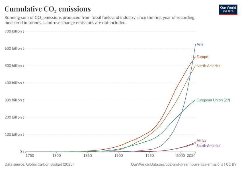 Global Carbon Budget (2025) – with major processing by Our World in Data. “Cumulative CO₂ emissions” [dataset]. Global Carbon Project, “Global Carbon Budget v15” [original data]. Retrieved March 20, 2026 from https://archive.ourworldindata.org/20260304-094028/grapher/cumulative-co-emissions.html (archived on March 4, 2026).