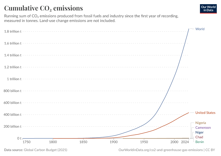 Global Carbon Budget (2025) – with major processing by Our World in Data. “Cumulative CO₂ emissions” [dataset]. Global Carbon Project, “Global Carbon Budget v15” [original data]. Retrieved November 17, 2025 from https://archive.ourworldindata.org/20251114-145720/grapher/cumulative-co-emissions.html (archived on November 14, 2025).