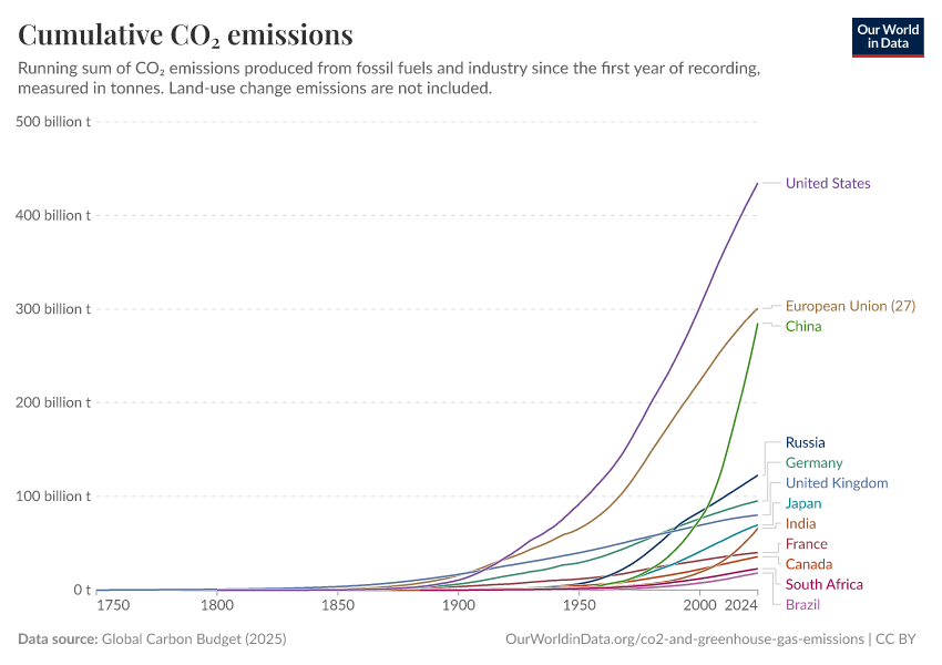 Global Carbon Budget (2025) – with major processing by Our World in Data. “Cumulative CO₂ emissions” [dataset]. Global Carbon Project, “Global Carbon Budget v15” [original data]. Retrieved December 14, 2025 from https://archive.ourworldindata.org/20251204-133459/grapher/cumulative-co-emissions.html (archived on December 4, 2025).