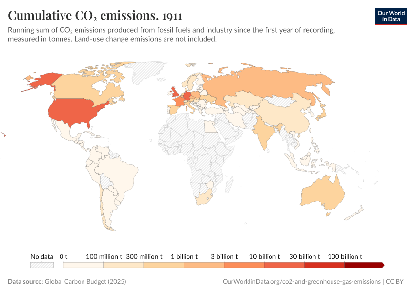 “Data Page: Cumulative CO₂ emissions”, part of the following publication: Hannah Ritchie, Pablo Rosado, and Max Roser (2023) - “CO₂ and Greenhouse Gas Emissions”. Data adapted from Global Carbon Project. Retrieved from https://archive.ourworldindata.org/20251204-133459/grapher/cumulative-co-emissions.html [online resource] (archived on December 4, 2025).How to cite this data