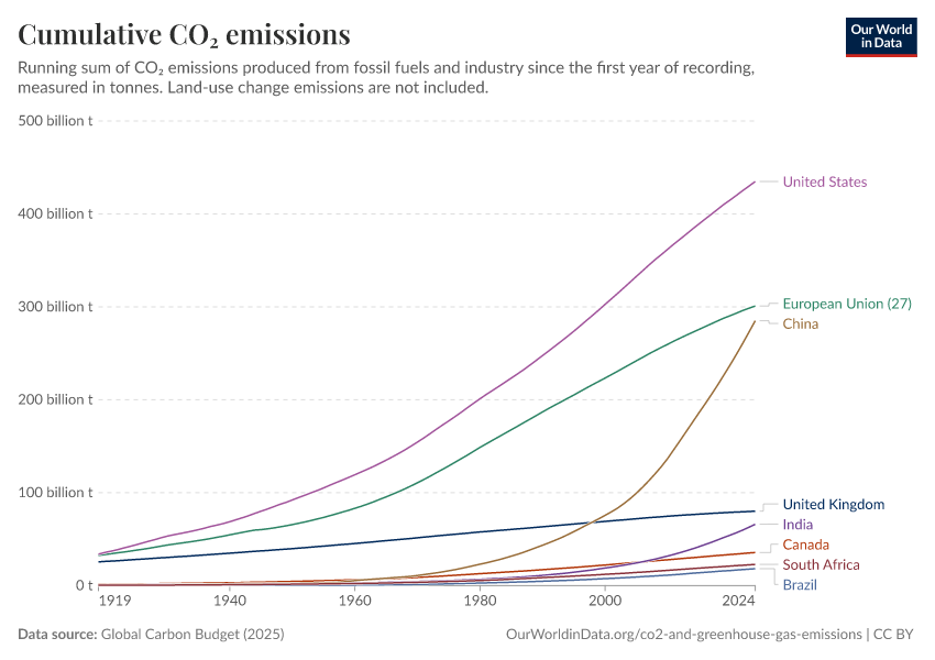 Global Carbon Budget (2025) – with major processing by Our World in Data. “Cumulative CO₂ emissions” [dataset]. Global Carbon Project, “Global Carbon Budget v15” [original data]. Retrieved February 23, 2026 from https://archive.ourworldindata.org/20260119-070102/grapher/cumulative-co-emissions.html (archived on January 19, 2026).
