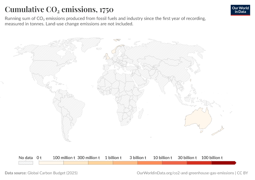 “Data Page: Cumulative CO₂ emissions”, part of the following publication: Hannah Ritchie, Pablo Rosado, and Max Roser (2023) - “CO₂ and Greenhouse Gas Emissions”. Data adapted from Global Carbon Project. Retrieved from https://archive.ourworldindata.org/20251204-133459/grapher/cumulative-co-emissions.html [online resource] (archived on December 4, 2025).How to cite this data