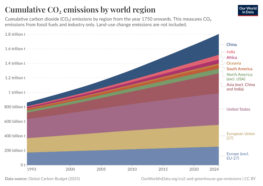 Global Carbon Budget (2025) – with major processing by Our World in Data. “Cumulative CO₂ emissions by world region” [dataset]. Global Carbon Project, “Global Carbon Budget v15” [original data]. Retrieved December 6, 2025 from https://archive.ourworldindata.org/20251204-133459/grapher/cumulative-co2-emissions-region.html (archived on December 4, 2025).