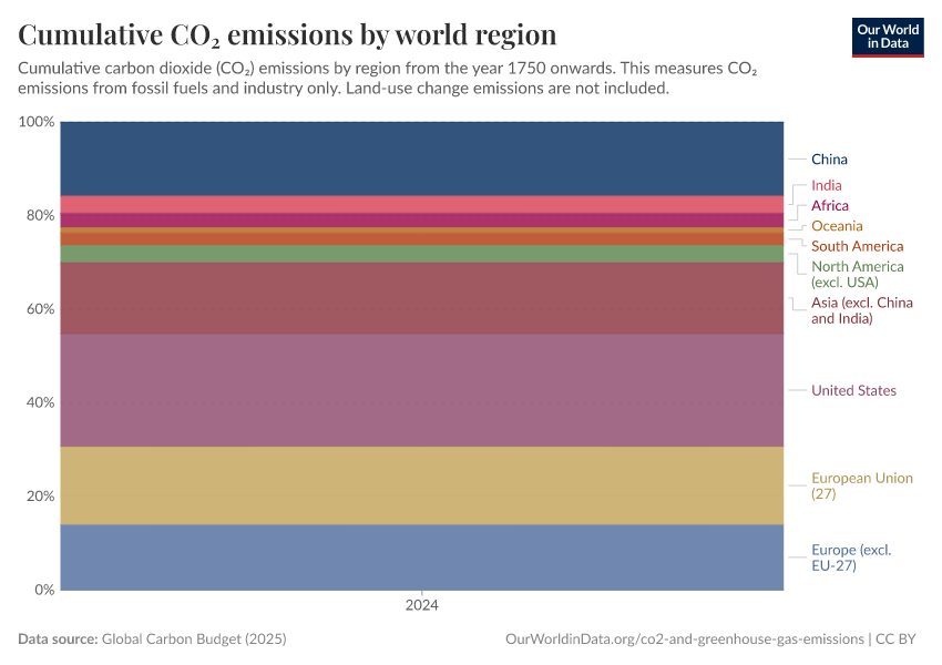 Global Carbon Budget (2025) – with major processing by Our World in Data. “Cumulative CO₂ emissions by world region” [dataset]. Global Carbon Project, “Global Carbon Budget v15” [original data]. Retrieved December 13, 2025 from https://archive.ourworldindata.org/20251204-133459/grapher/cumulative-co2-emissions-region.html (archived on December 4, 2025).