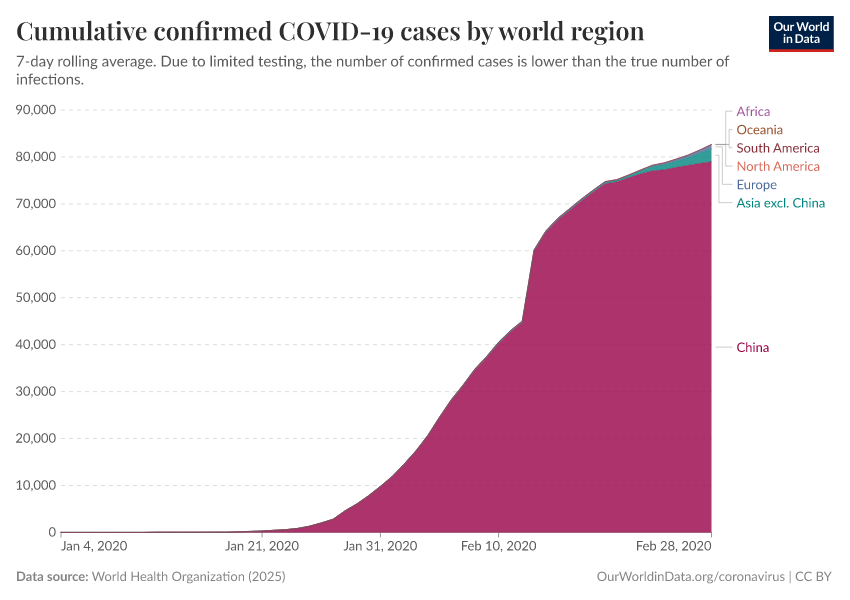 “Data Page: Cumulative confirmed COVID-19 cases by world region”, part of the following publication: Edouard Mathieu, Hannah Ritchie, Lucas Rodés-Guirao, Cameron Appel, Daniel Gavrilov, Charlie Giattino, Joe Hasell, Bobbie Macdonald, Saloni Dattani, Diana Beltekian, Esteban Ortiz-Ospina, and Max Roser (2020) - “COVID-19 Pandemic”. Data adapted from World Health Organization. Retrieved from https://archive.ourworldindata.org/20251215-063346/grapher/cumulative-covid-cases-region.html [online resource] (archived on December 15, 2025).How to cite this data